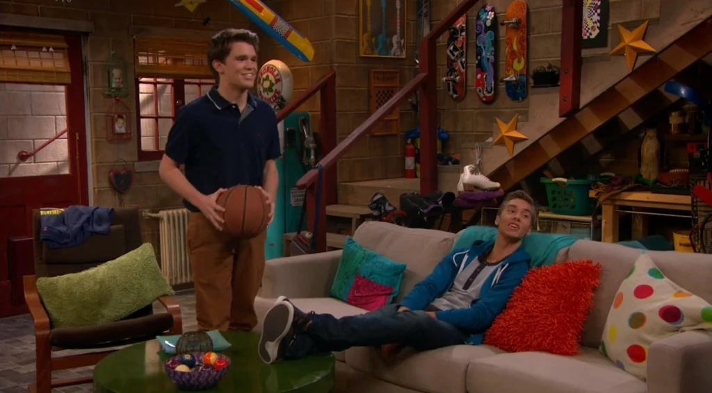 Garrett and Logan sit next to each other on the couch in the basement